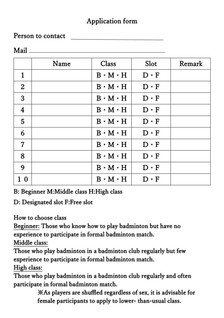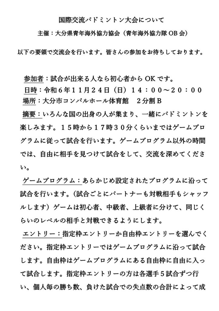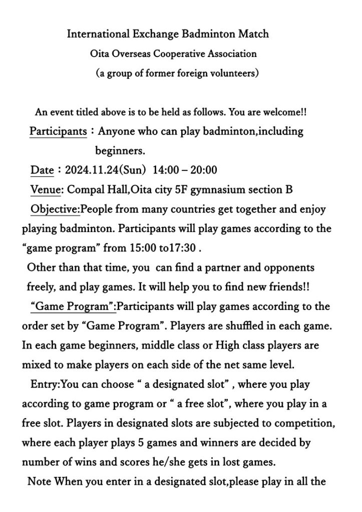 今年は技能実習生、ALT、留学生等様々な外国人に参加を呼びかけています。バドミントンというスポーツを通じて、世界のいろいろな国の人と友達になりませんか?詳しくは添付の要項をご覧ください。