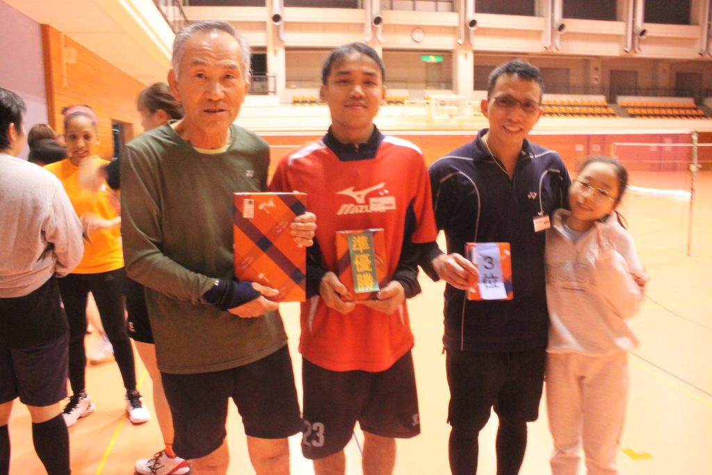 ゲームは1回毎にパートナーも変え計5試合での勝ち数等で競いました。優勝は日出町からきた岩尾さん、2位、3位はともにインドネシア人のバグスさんとバスティアンさんでした。